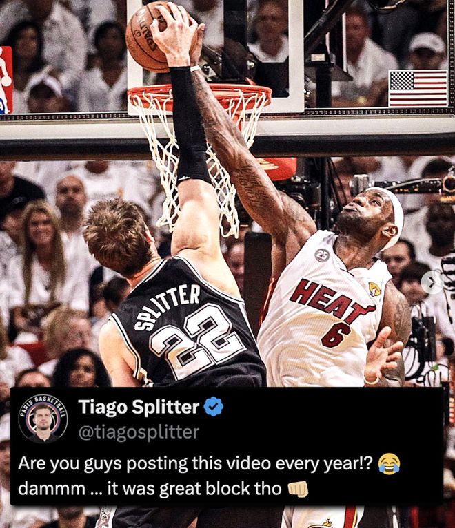 好在13-14赛季,斯普利特跟随马刺实现了复仇,并在总决赛G1也盖了一个詹姆斯帽,以4-1击败热火夺得了NBA总冠军,而他也成为首个夺得NBA总冠军的巴西球员。