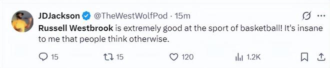 美记JD杰克逊:拉塞尔-威斯布鲁克在篮球这项运动上表现得极为出色!让我感到不可思议的是,竟然还有人持相反的看法。